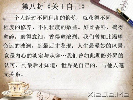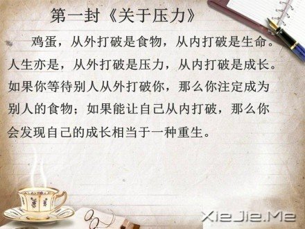 鸡蛋,从外打破是食物,从内打破是生命。人生亦是,从外打破是压力,从内打破是成长。如果你等待别人从外打破你,那么你注定成为别人的食物;如果能让自己从内打破,那么你会发现自己的成长相当于一种重生。